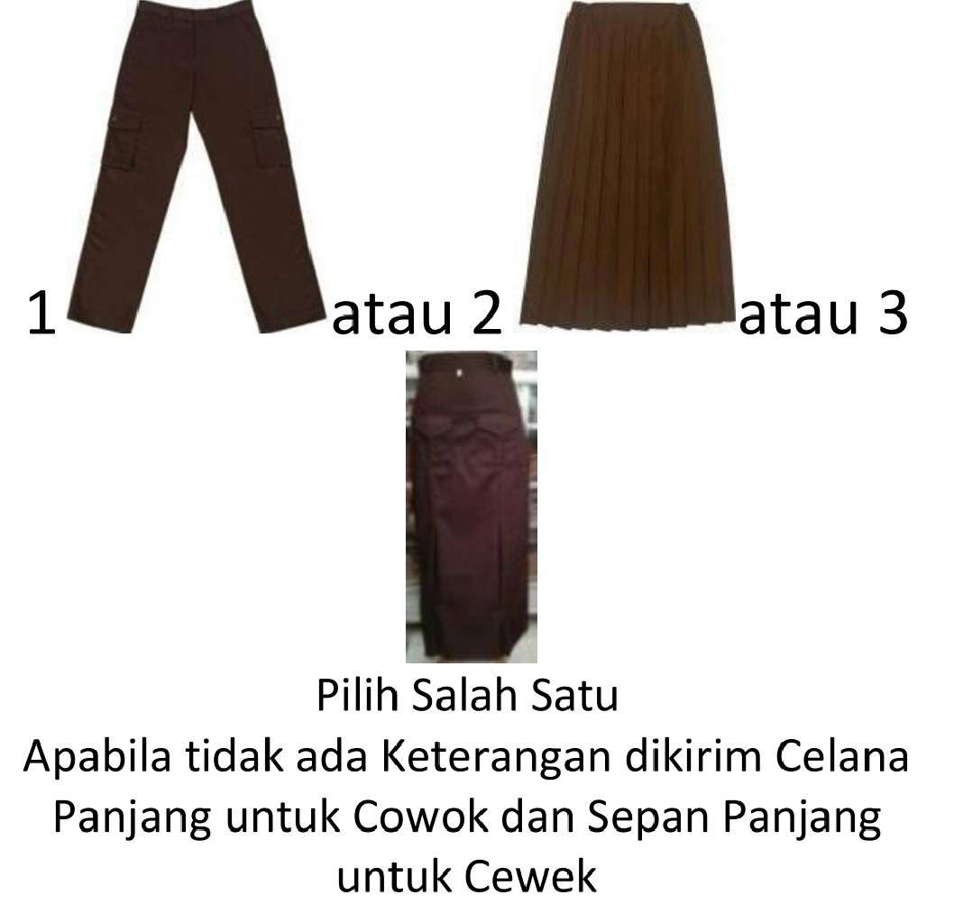• Celana panjang pramuka kantong 6 ATAU rok lipit panjang pramuka ATAU rok span panjang penggalang SMP (pilih salah satu)